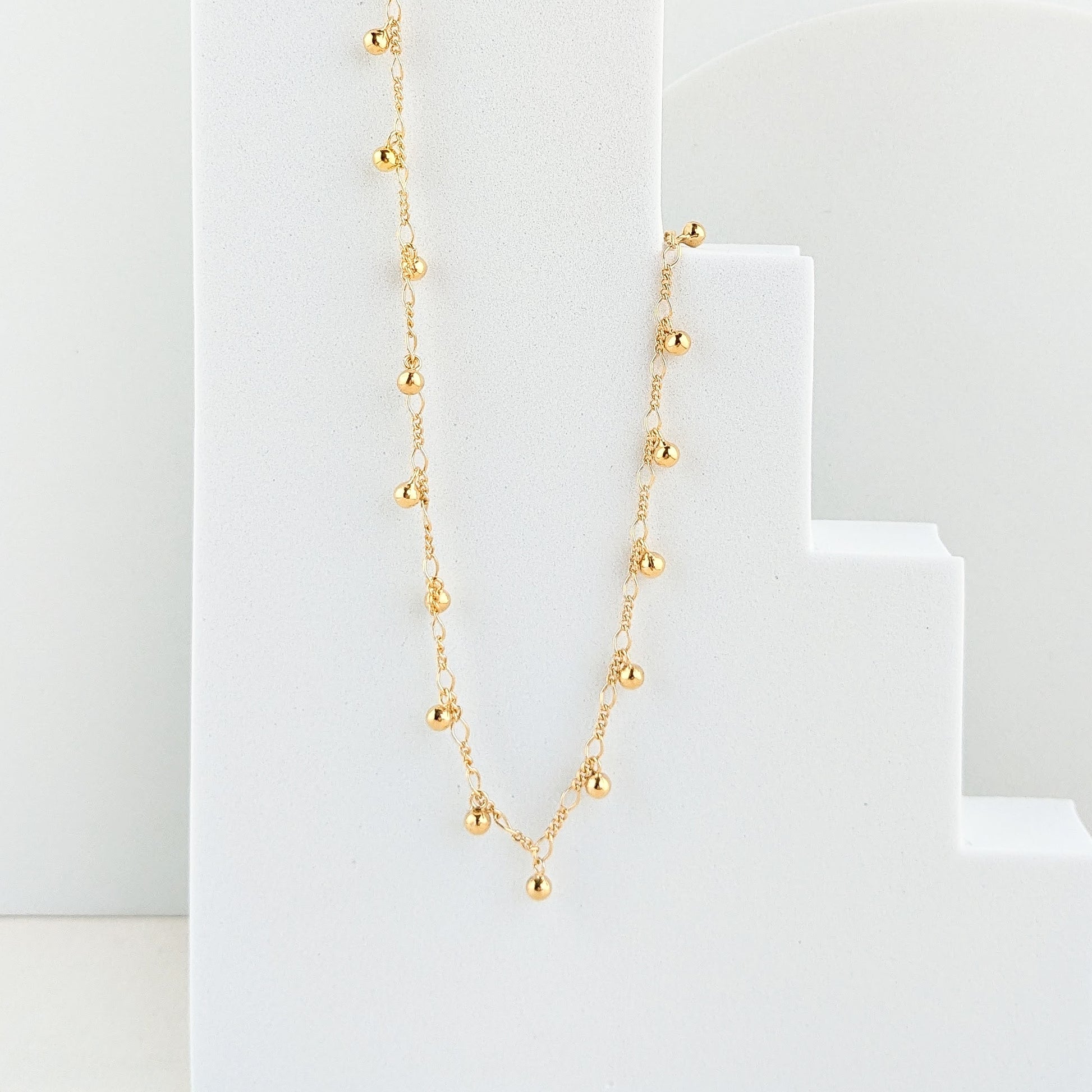 Add a bohemian energy to your style with the Beaded Fringe Necklace. Featuring a sparkling Figaro chain accented with light 4mm beads throughout. Made from 14K gold fill details. Lobster clasp.