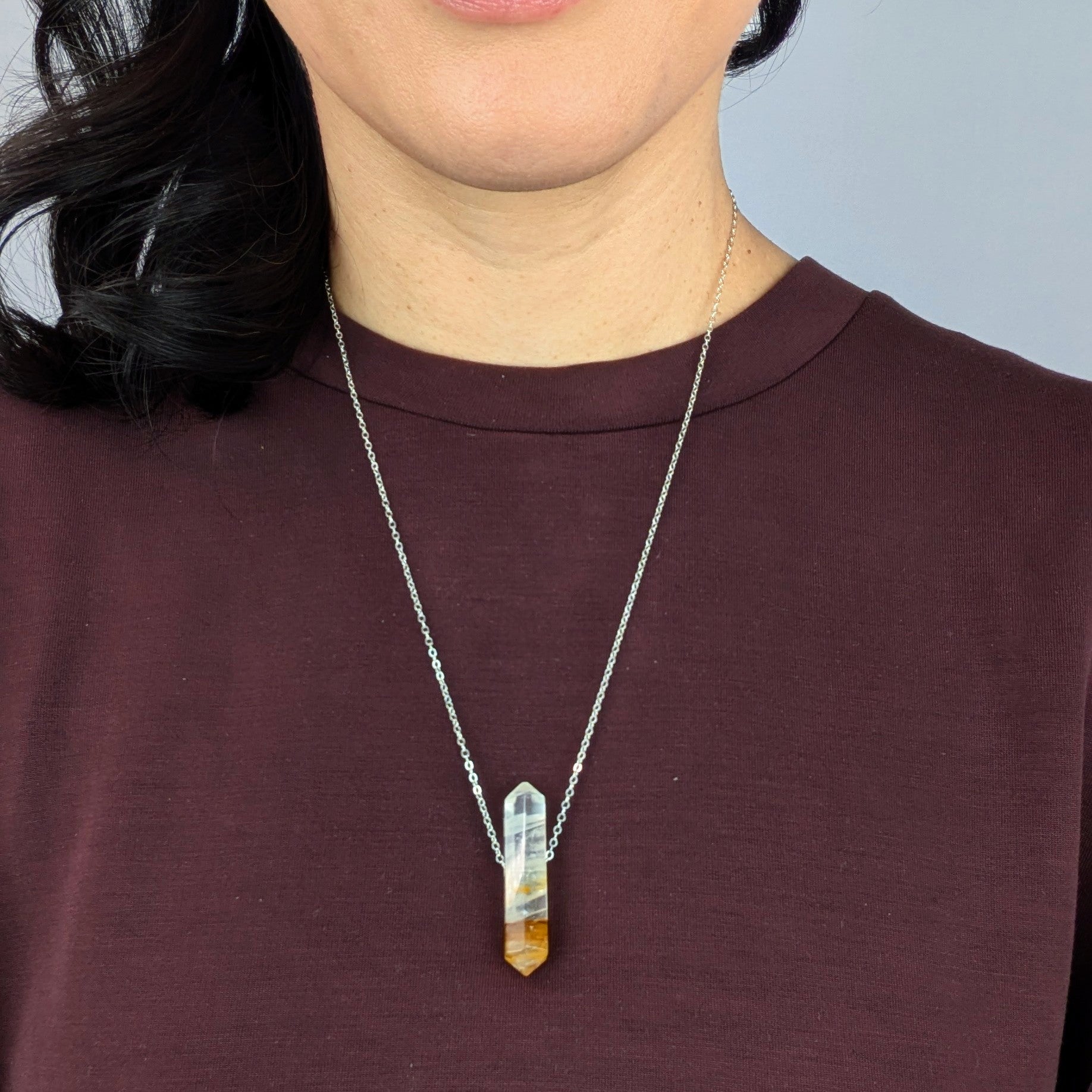 Tones range from clear to milky with yellow, orange, or brown hues. Each crystal is unique and has its own unique energy and character. Polished to a high shine and threaded on your choice of delicate 14K gold fill or sterling silver chain.