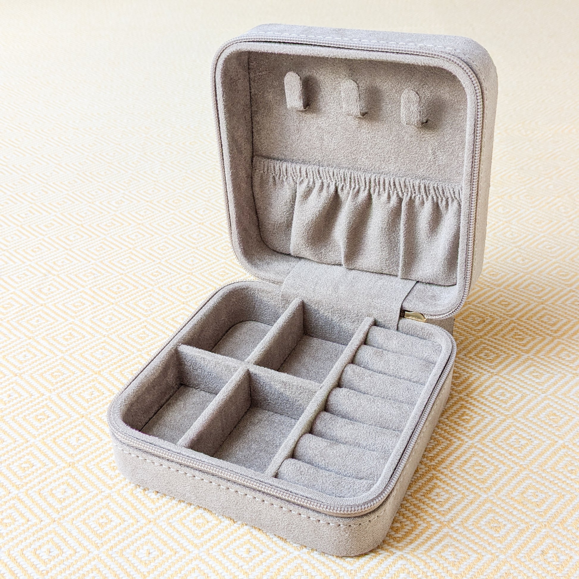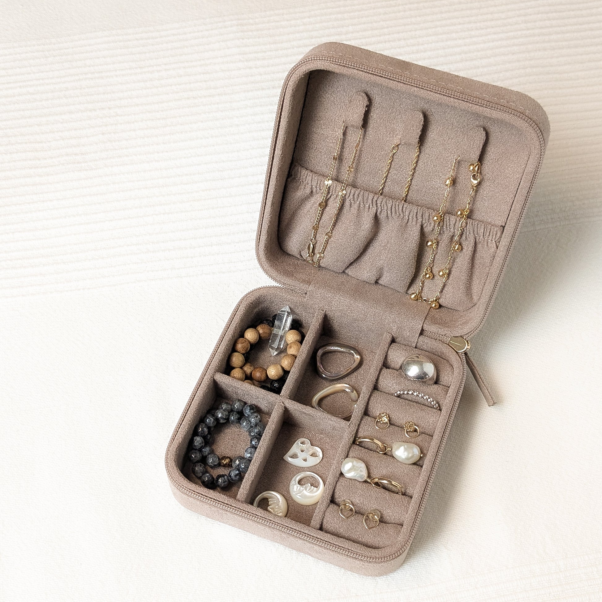The Jewelry Case protects your favorite jewelry from tangles and tarnish. Made from luxurious and soft warm grey faux suede, and small enough to fit in the palm of your hand. Hang necklaces from hooks on the inner lid and rest pendants in the small pouch. Lay your earrings and bracelets fit in the adjustable compartments, and nestle your rings inside.